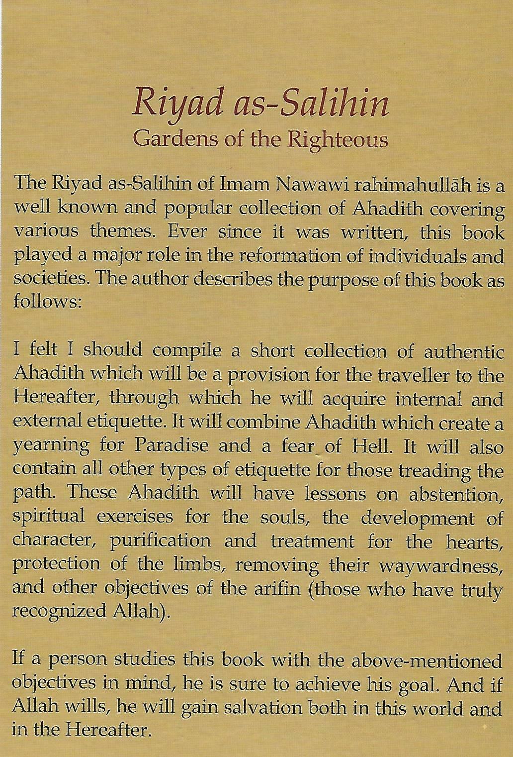 The Riyad as-Salihin of Imam Nawawi is a well known and popular collection of hadiths covering various themes. The purpose of the book, in the words of the author, is: