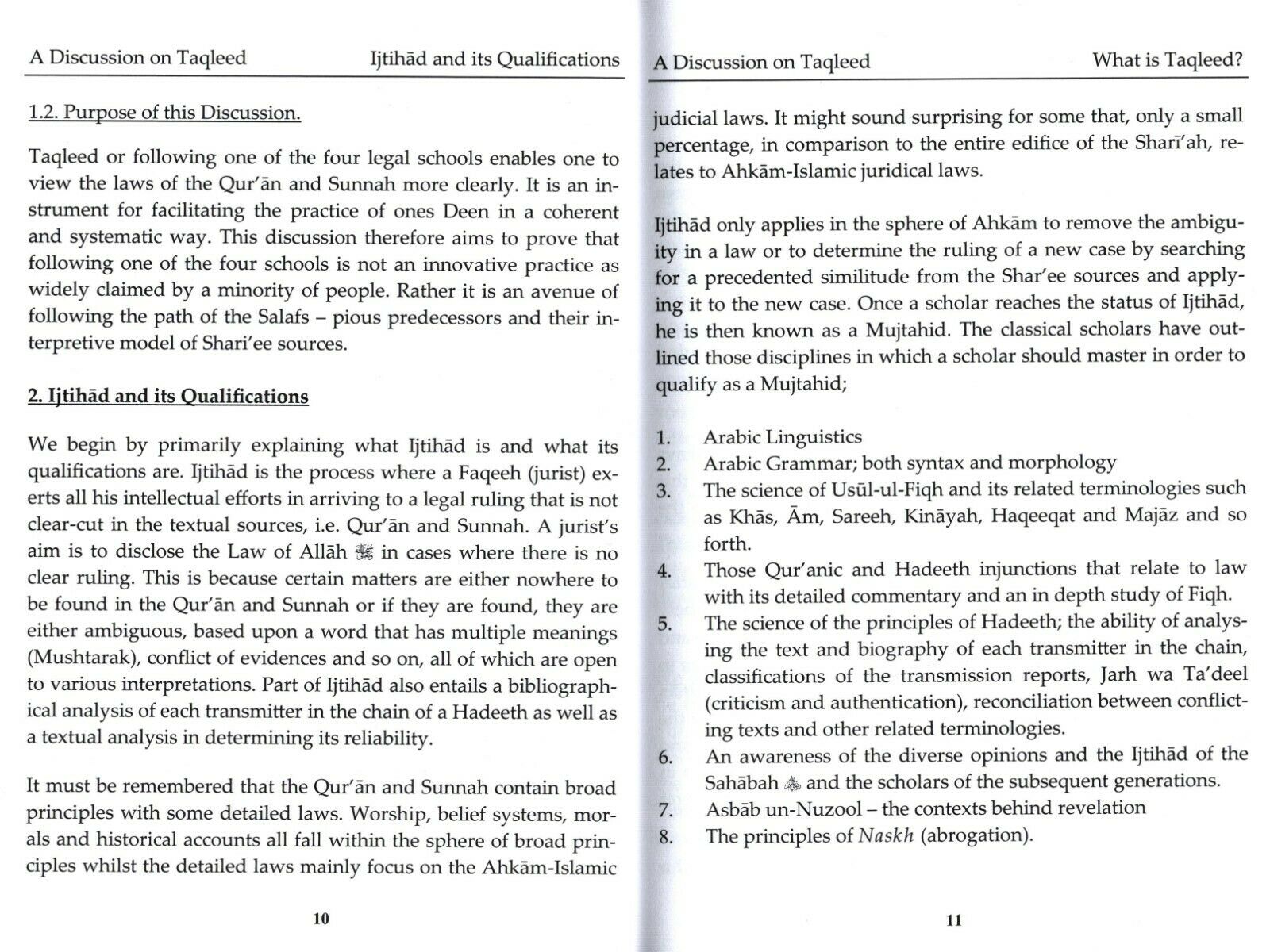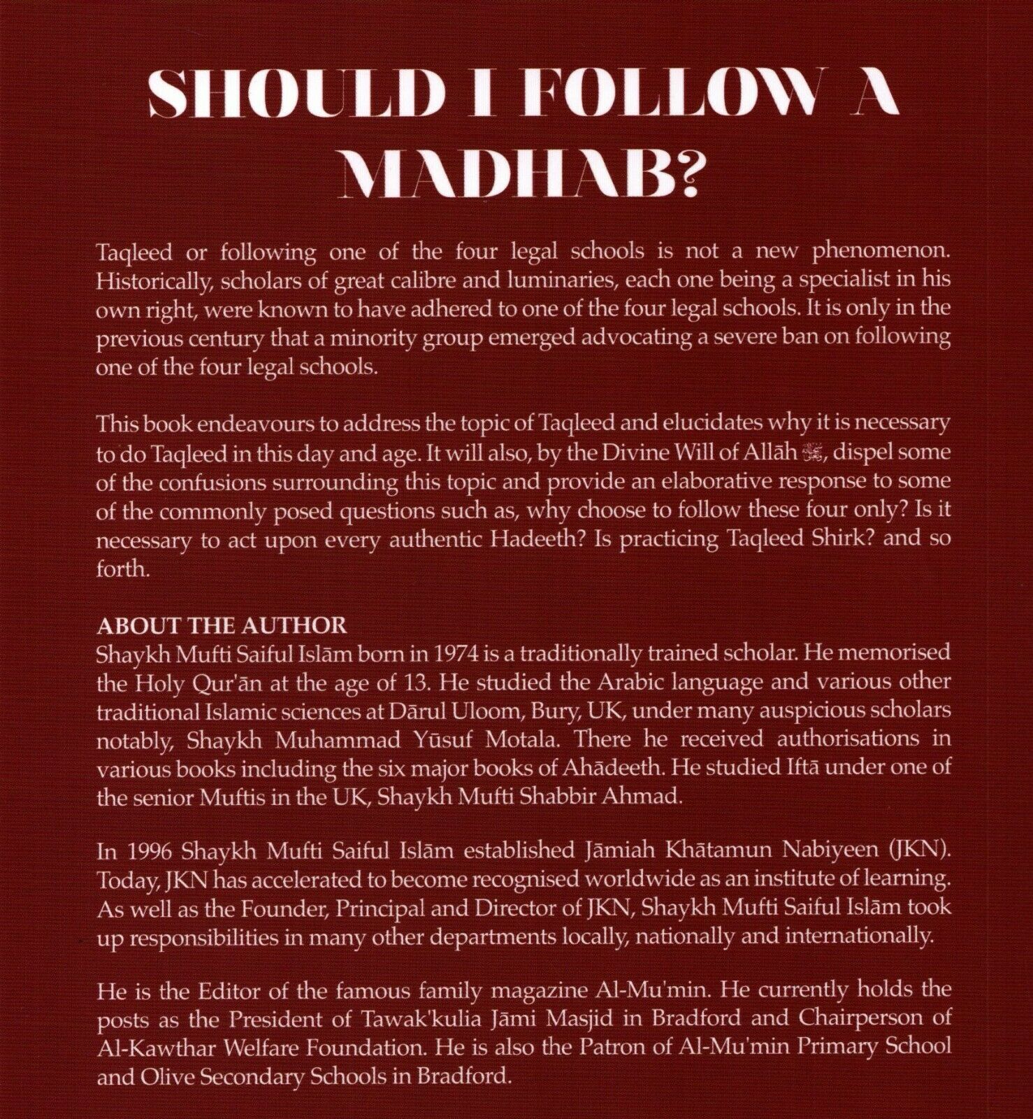 This book endeavours to address the topic of Taqleed and elucidates why it is necessary to do Taqleed in this day and age. It will also, by Divine Will of Allah Ta'ala, dispel some of the confusions surrounding this topic and provide an elaborative response to some of the commonly posed questions such as, why choose to follow these four only? Is it necessary to act upon every authentic Hadeeth? Is practicing Taqleed Shirk? and son forth.